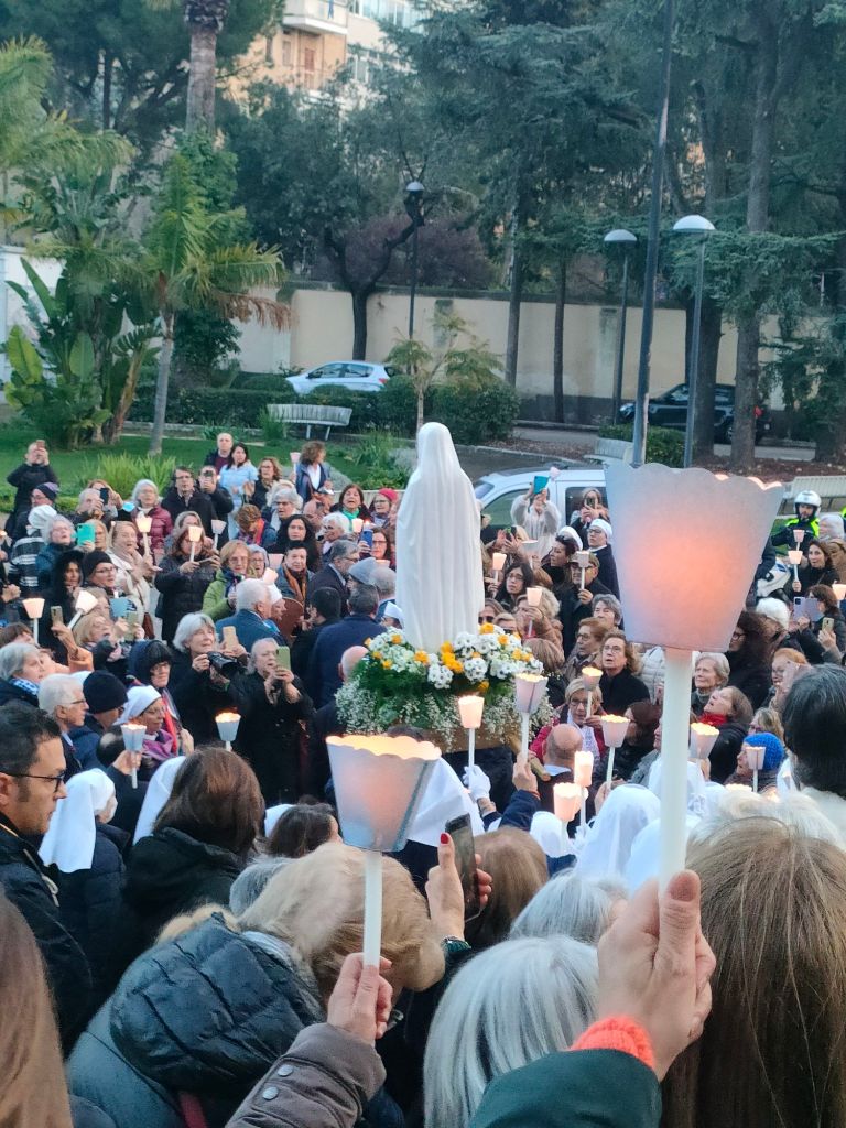 Oggi pomeriggio c’ e’ stato un incontro bellissimo all’ Oncologico di Bari , l’ immagine della Madonna  di Lourdes ha sostato per mezza giornata in questo luogo di sofferenza e di cura,  io ero venuta a conoscenza  tempo fa di questo appuntamento ma come tutte le cose che mi appartengono era caduto in quel cassetto dei ” poi vediamo”.   Da  un po’ le mie amiche della corsa mattutina stanno diventando importanti, Stella  quasi un braccio destro e così oggi siamo andate organizzandoci  quasi come fosse una   specie di pellegrinaggio. In realtà io a casa mia ho una immagine della Madonna presa a Lourdes nel 2015, uguale all’ originale della grotta tante’ che la sera prima di dormire mi accerto di un lume per la notte che  non La faccia stare al buio e dopo una velocissima Ave Maria salgo le scale con la sensazione di aver lasciato una persona di famiglia a vegliare il nostro sonno. Giunte in ospedale un ampio salone affollatissimo era allestito per il Rosario, ovunque dame e volontari ed una folla interminabile di persone in fila composte e silenziose ed infine, un po’ distante, Aquero’ ( la signora) pareva quasi aspettarmi ed io una volta arrivata davanti mi sono messa di fianco e ci sono rimasta un po,  pochissimo penso,  anche se a me sono sembrati attimi interminabili, le ho detto alcune cose quasi all’ orecchio, due  o tre cose, che da un po’ sono sempre le stesse e poi ho cercato un posto nella sala facendomi spazio tra la folla.  Ho continuato a guardarLa per tutto il tempo, era esattamente difronte a me e mi continuavo a dire che forse le cose che Le avevo sussurrato dovevo dirgliele meglio, argomentare in maniera più completa magari facendo un rapido resoconto con me stessa per capire se Le avevo detto proprio tutto, ma poi , quando se n’ e’ andata ho capito che pure questa volta mi stava ascoltando ed anzi mi stava proprio aspettando e vederLa andare via e’ stato un altro arrivederci, credo che oggi per Grazia ho assistito ad un altro miracolo di Maria che quando scende quaggiù parla a noi con le parole di Lassù !