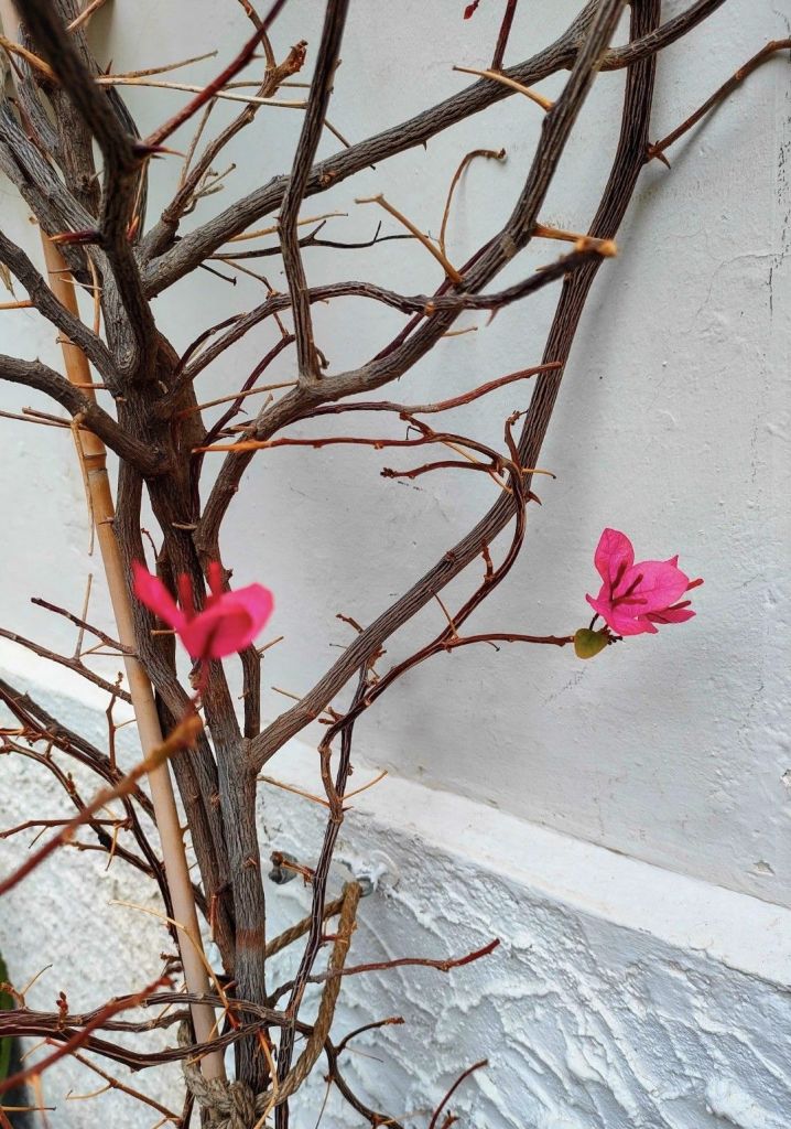 Man mano che gli anni passano mi  comincio ad interrogare e rivedo la  vita da mille prospettive diverse, riavvolgo il nastro e mi rivedo in certe scene, rivedo i colori, i vestiti, le voci e persino gli umori. Penso da un po’ che i miei ragazzi siano un dono ed anzi certe volte questa cosa la dico a voce alta e come tutti i doni arrivano per migliorarti, per darti la possibilità di essere un altra persona perché insieme a loro appari persino più ricca e se quando erano piccoli hai avuto  la sensazione netta di condurre un gioco in cui le pedine le gestivi tu adesso cominci a capire che non e’ proprio così perché i figli ti spostano il baricentro con quel loro modo di voler camminare con le loro gambe e basta. Ecco, ora per me, essere madre rappresenta un banco di scuola perenne dove io siedo per imparare lezioni difficili da mandare giù talvolta, perché sto imparando, ad esempio, l’ arte del silenzio che e’ cosa difficilissima per me ed insieme al silenzio sopraggiunge l’ ascolto che e’ preludio di saggezza. I miei ragazzi crescono e con loro cresce la consapevolezza che tanto miei non sono e di questo sono grata, appartengono ad una pianta talvolta brulla e magari spoglia che gli permette però di fiorire pure in pieno inverno come questo bouganville incrociato per strada qualche giorno fa, due fiori, esattamente come loro, due fiori che si discostano dalla pianta totalmente ma che per bellezza, coraggio e colore gli appartengono, due ragazzi, due vite, due cose diverse che  vivono attaccate alla stessa radice e questo e’ davvero un miracolo!